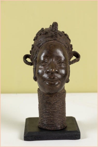 Secretly, he had cast a small bronze head of Imiamia, which he had kept well hidden. He had wanted to cast an image of her to capture the caring that inspired him. Adé would uncover the small bronze head each day before beginning his work, caress its face, and draw inspiration from it. It allowed him a way to inspire his art. Then he would carefully return it to its hiding place, where he felt no one would find it.